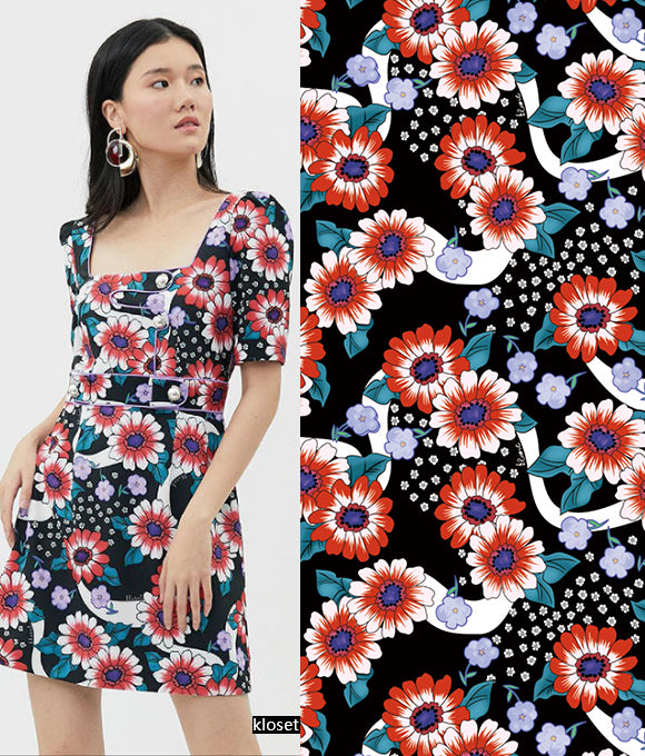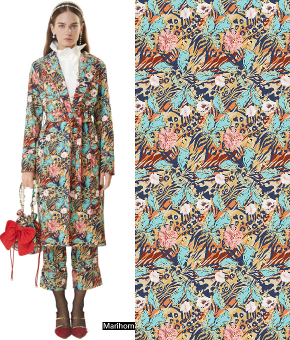 Con un enfoque en la moda y la elegancia como tema central, esta propuesta utiliza patrones artísticos de colores contrastantes como fuente de inspiración. Se fusionan estampados abstractos y llamativos, dibujados a mano, combinados con elementos de moda como flores y figuras geométricas distintivas. Los detalles están cuidadosamente elaborados, con colores vibrantes que iluminan el diseño, añadiendo dinamismo a los patrones florales. Se rompe la monotonía visual tradicional, ofreciendo una estética simple pero imponente, que equilibra una apariencia pulida y profesional con un toque elegante. El impacto visual resalta un estilo romántico e intelectual, aportando un aire moderno y refinado a los patrones florales.