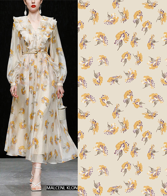 Las flores texturizadas que cubren el vestido se abren libremente, como si fueran una pintura al óleo, tranquilas y hermosas. Los pétalos delicados y complejos están delineados con líneas minuciosas, y la cuidadosa selección de colores se despliega de manera natural, danzando en una romántica luz retro. Tanto los patrones como los colores tienen una gran sensación de estilo. Las flores complejas y fragmentadas muestran un tono único y un suave sentido artístico