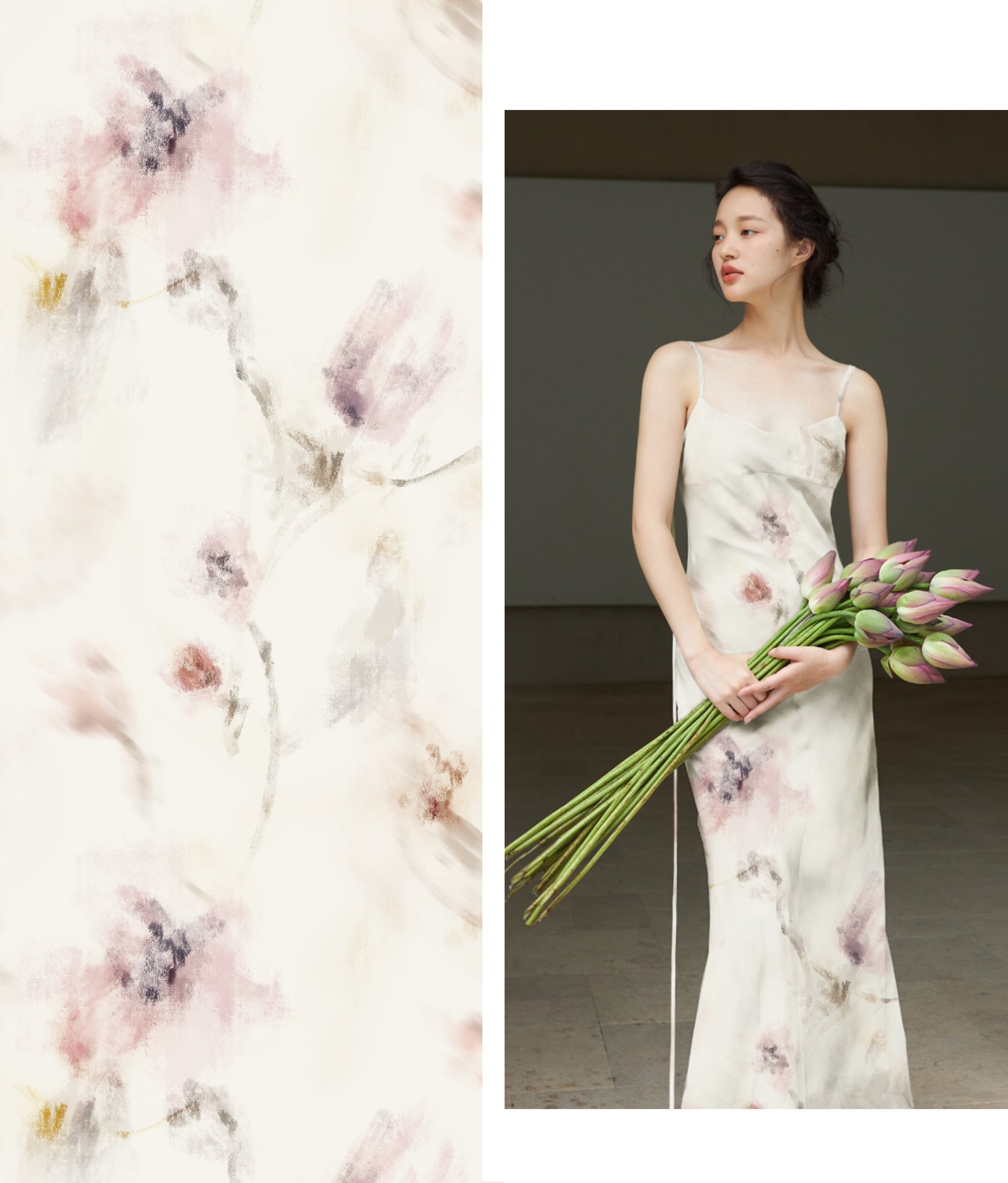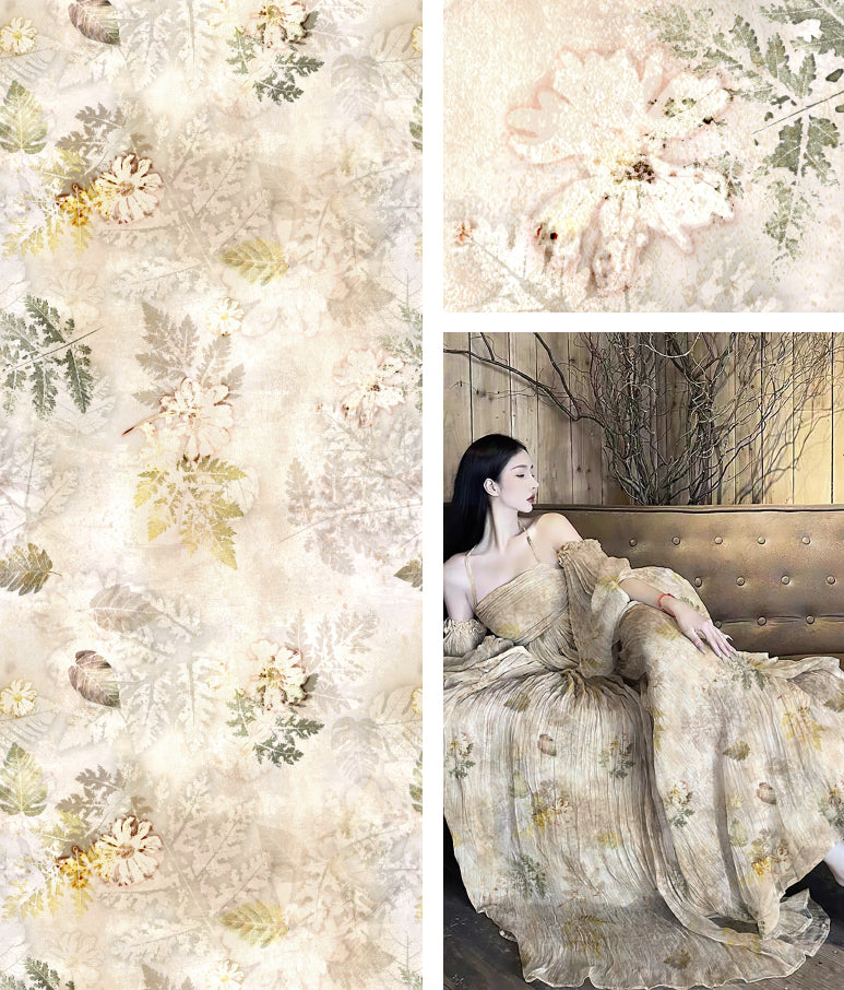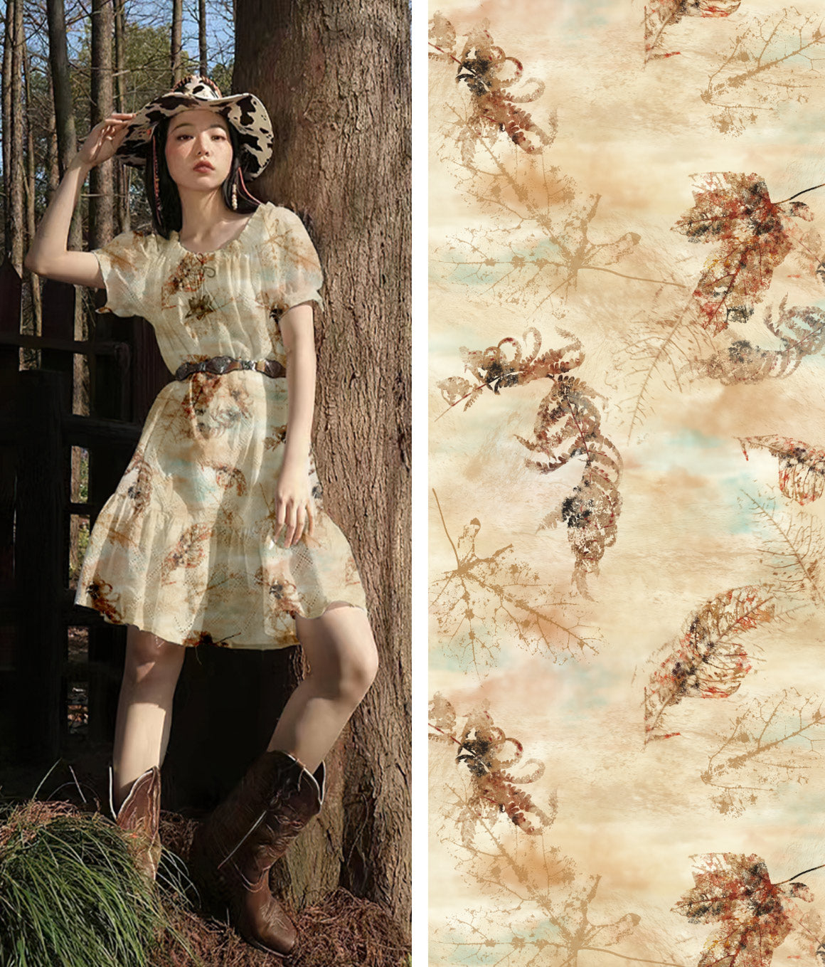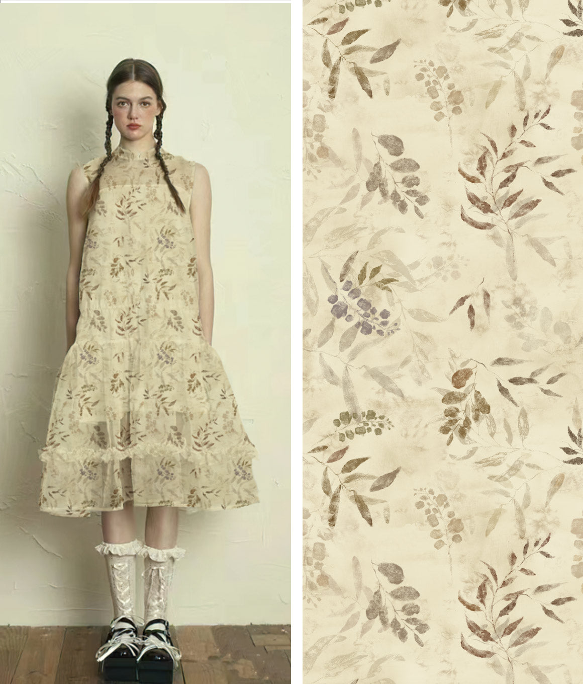 La colección fusiona la frescura del estilo campestre con la elegancia romántica francesa, presentando pétalos irregulares y sutiles que parecen bailar con el viento. La estética es a la vez radiante y alegre, evocando una sensación de libertad y dinamismo. "Espectros del Follaje" combina una atmósfera de vacaciones relajadas con un fuerte sabor moderno y una rica influencia artística, ofreciendo piezas que son tanto visualmente impactantes como emocionalmente evocadoras.