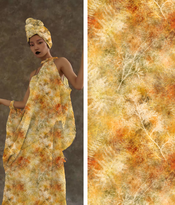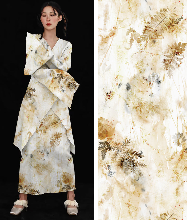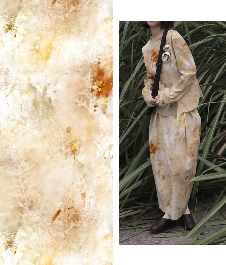 La colección "Espectros del Follaje" se inspira en la antigua tradición del teñido vegetal, capturando una sensación de naturalidad y comodidad. Los diseños de esta colección extraen colores y estética directamente de la naturaleza, transformándolos en nuevas formas que innovan los patrones tradicionales de teñido vegetal.